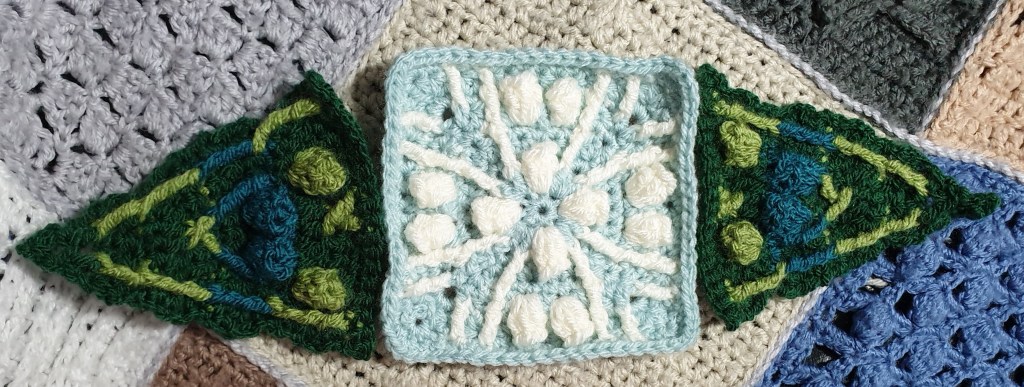 Yesterday, part 2 of the CAL came out (a triangle), and I’ve done a couple to see what they’re like. I will go back to squares now and finish them all before I get going in earnest with the triangles.