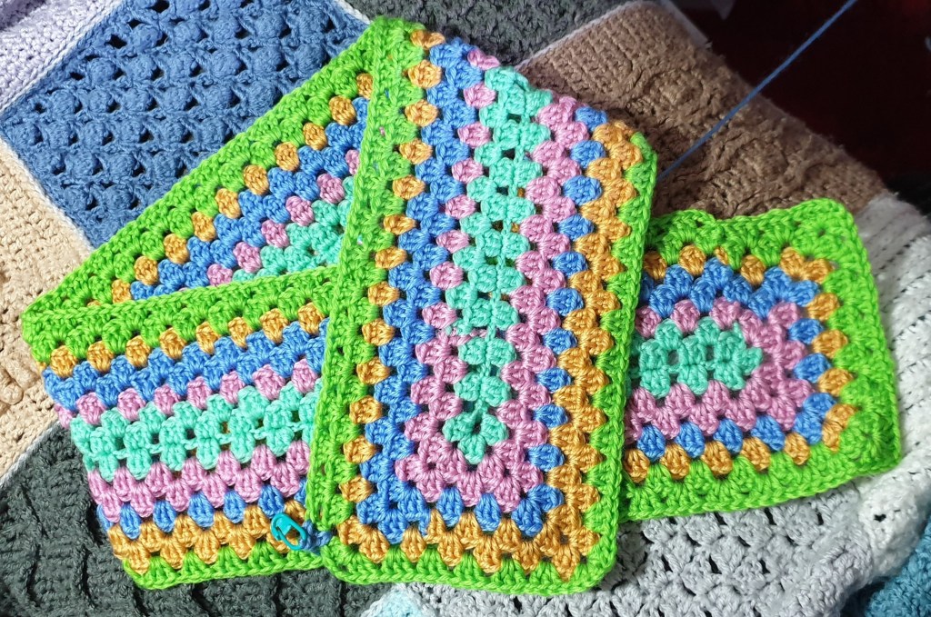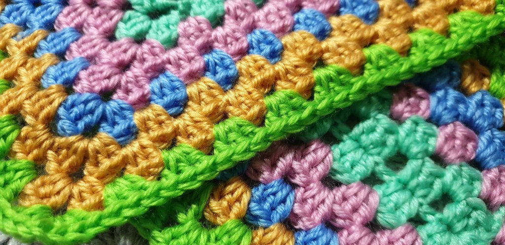 The other day my daughter and I were commenting that our leather sofa is cold when you first sit on it, and saying we should have a blanket over it. We already snuggle ourselves with crochet blankets on cold evenings, but we don’t have one big enough to cover the sofa. As I’ve recently had a yarn sort-out, I was aware of how many small balls of yarn I have, so I decided that I will make a simple granny square style blanket from random small balls or leftover bits of yarn.