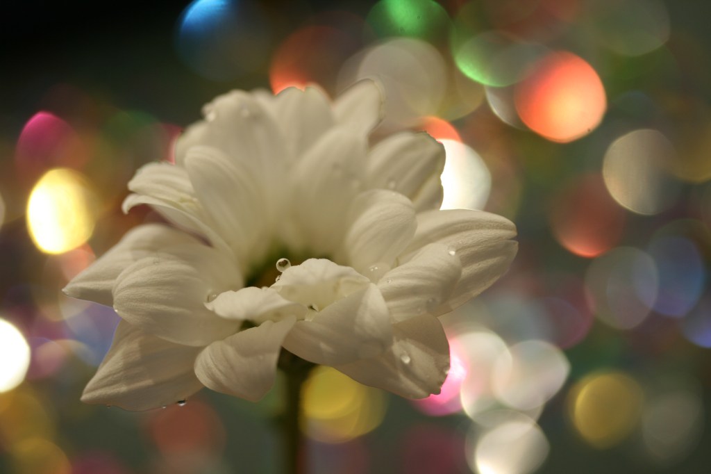 I had a bunch of multicoloured sequins spread out on the table, and then stood the flower in front of them. If you get the distance between the flower and sequins right, and of course the depth of field sufficiently shallow/narrow then they make lovely bokeh 🙂