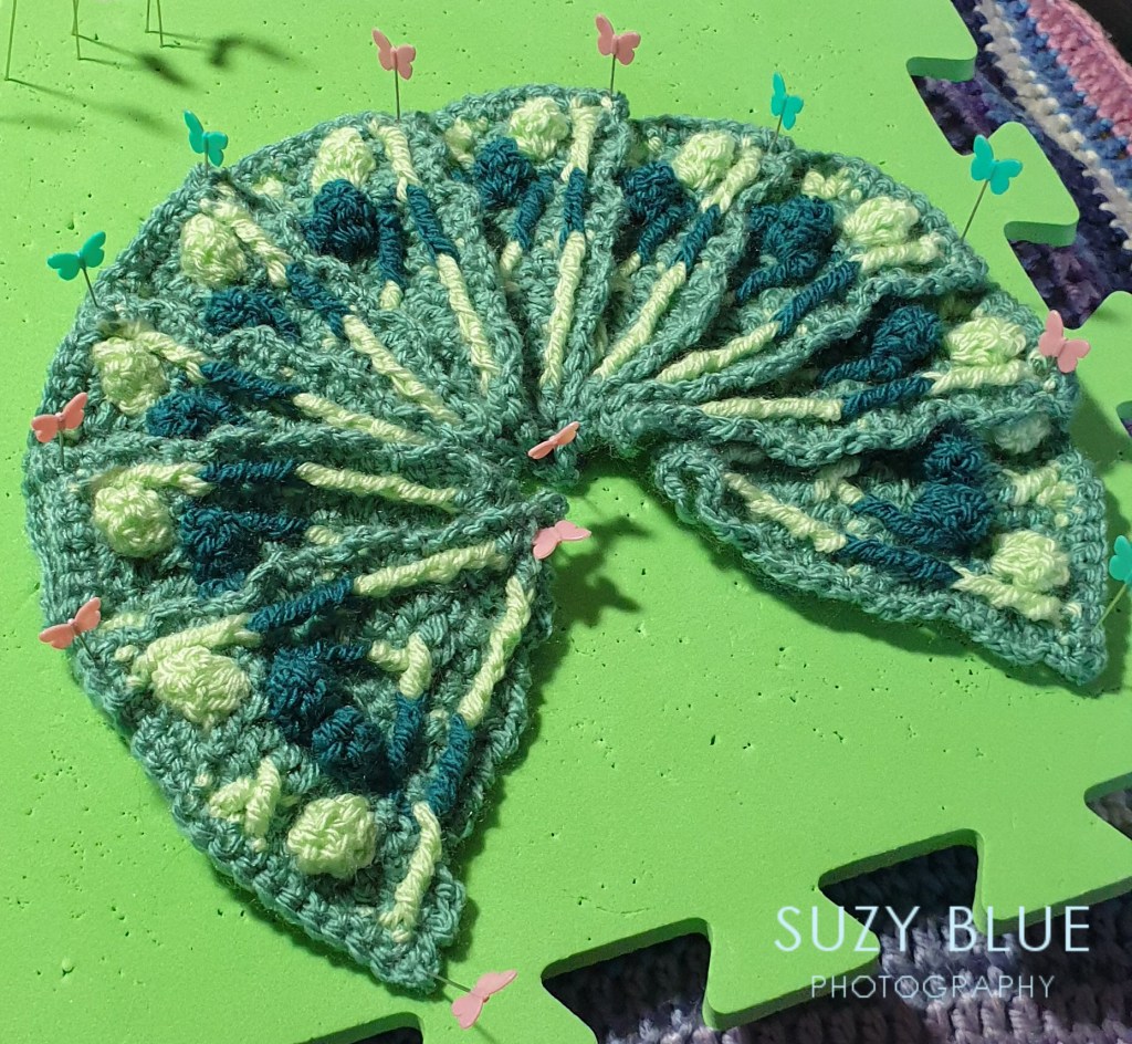 I’m not actually blocking them, but they curl up a lot, so they’re easier to photograph when pinned down. So I pin them, take a photo and then pop them in my bag of completed parts. I say completed … but some of them do need their ends sewn in. Not actually that many really, as I have been quite good, but I should probably have an end-sewing session soon.
