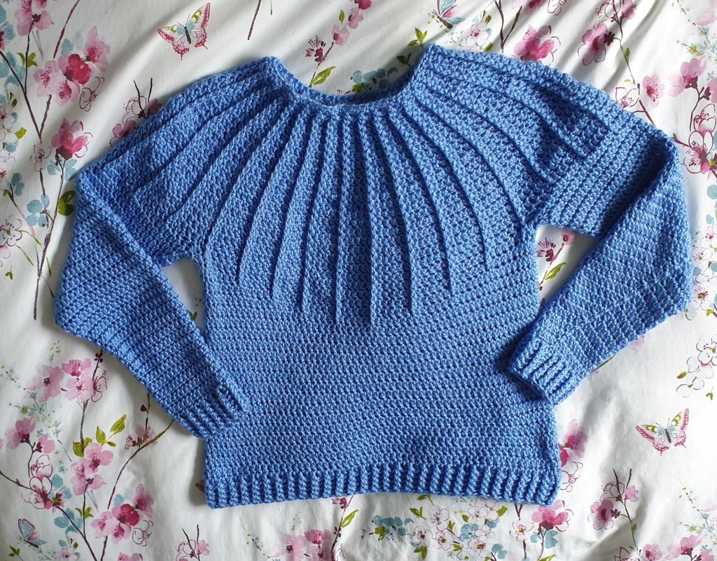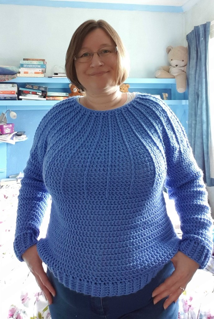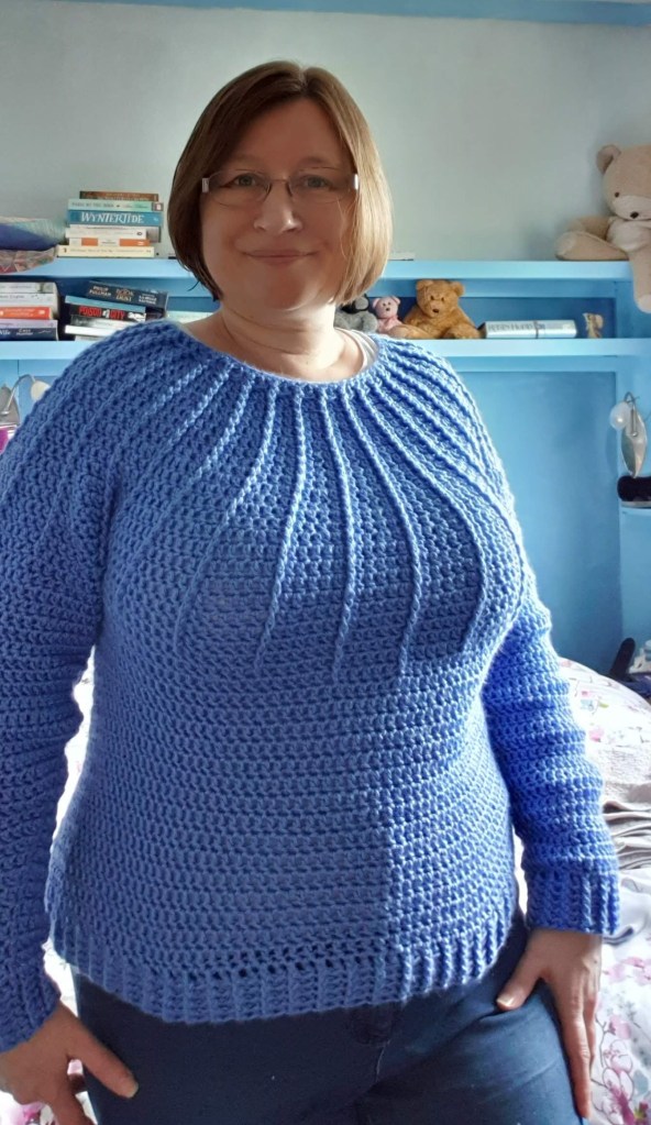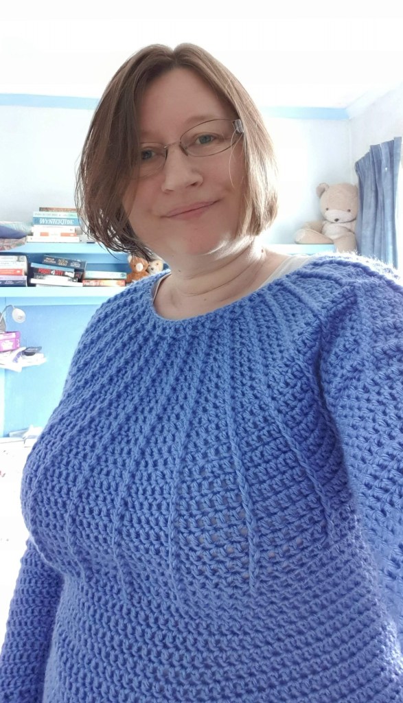 What I’ve done instead of triangles is finish off my Luna sweater (pattern by Courtney A Clark). Unfortunately I realised during the week that the first sleeve I did had gone a bit wrong, so after a bit of grumbling and cursing I frogged the sleeve and started again. Now I have 2 correct and matching sleeves, and I’m really happy with how it looks on me 🙂