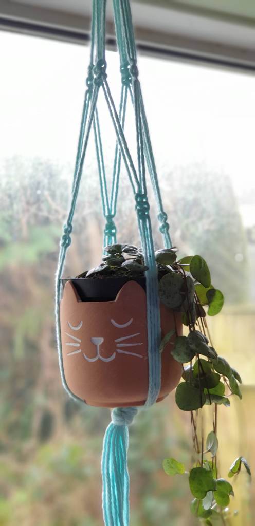 Today I’m going to try a bit of macrame. I have done a test and made this little pot holder, but now I have a bit of proper macrame yarn and I’m going to try and make a bigger one for my Christmas cactus to go in. We shall see how it goes.