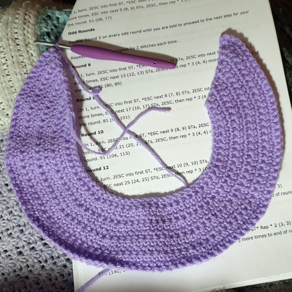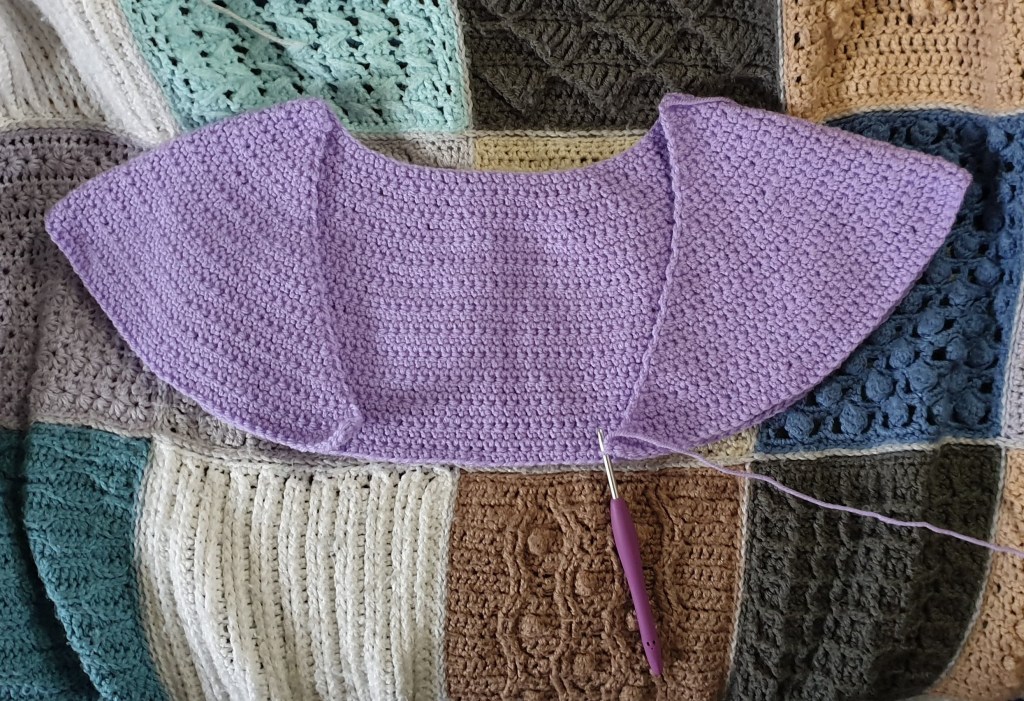 I have been crocheting though, of course… I bought myself a new (to me) dress from eBay the other day and it has some lilac colours in it. I thought, hmm, I could do with a lilac cardi to go with this. So with the help of a voucher, and a 3 for 2 offer, I got an excellent bargain on WI Premium Acrylic from HobbyCraft, and found a pattern I like. The pattern I’m using is actually one for a v-neck jumper which I’d already bought, but I think it will work well as a cardi too. It’s called Reina Sweater and the pattern is by Courtney A Clark.