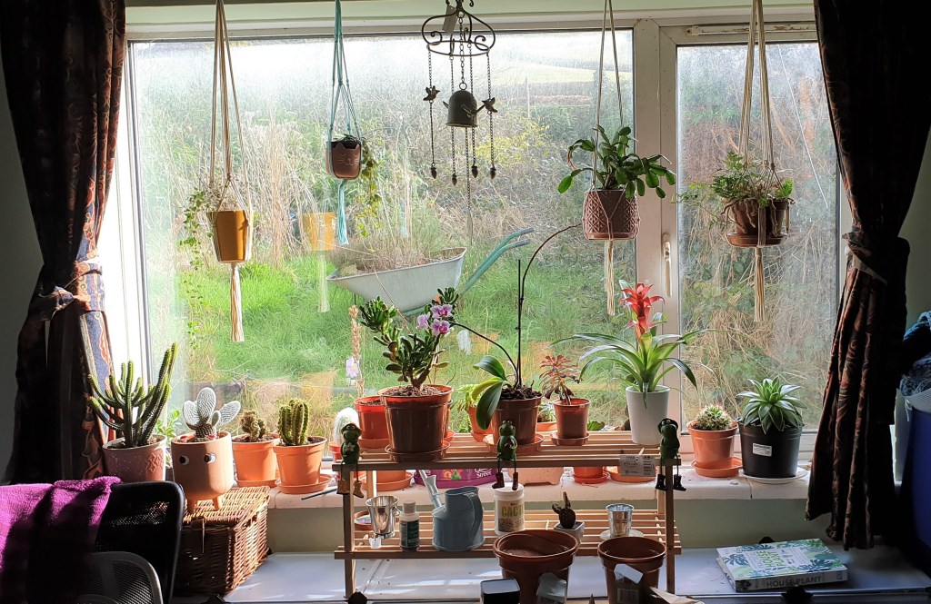 All the plants in the window, and you can also see our planted wheelbarrow outside!