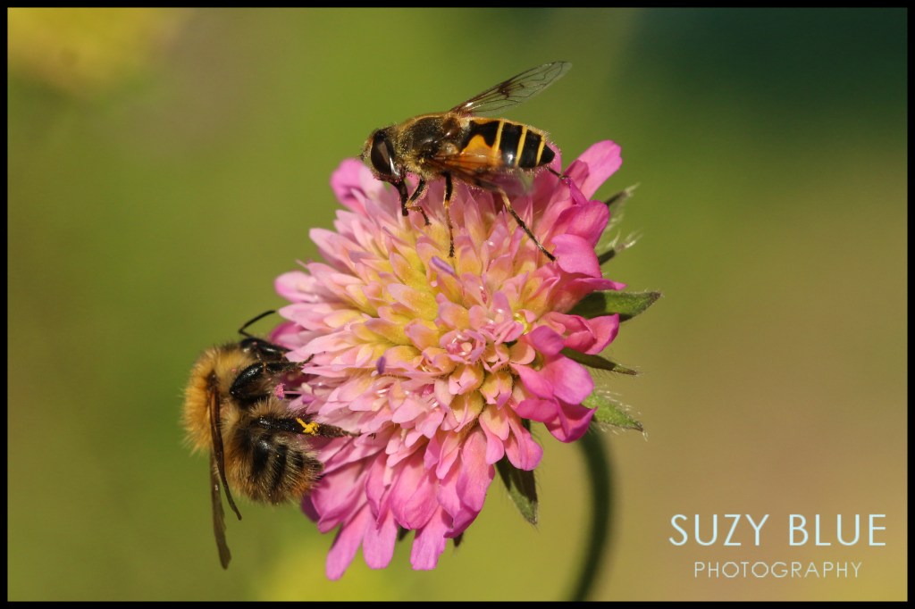 And just to show that it’s not just the hoverflies who are busy, here’s a scabious flower with a busy hoverfly (top) and a busy bee (bottom)!