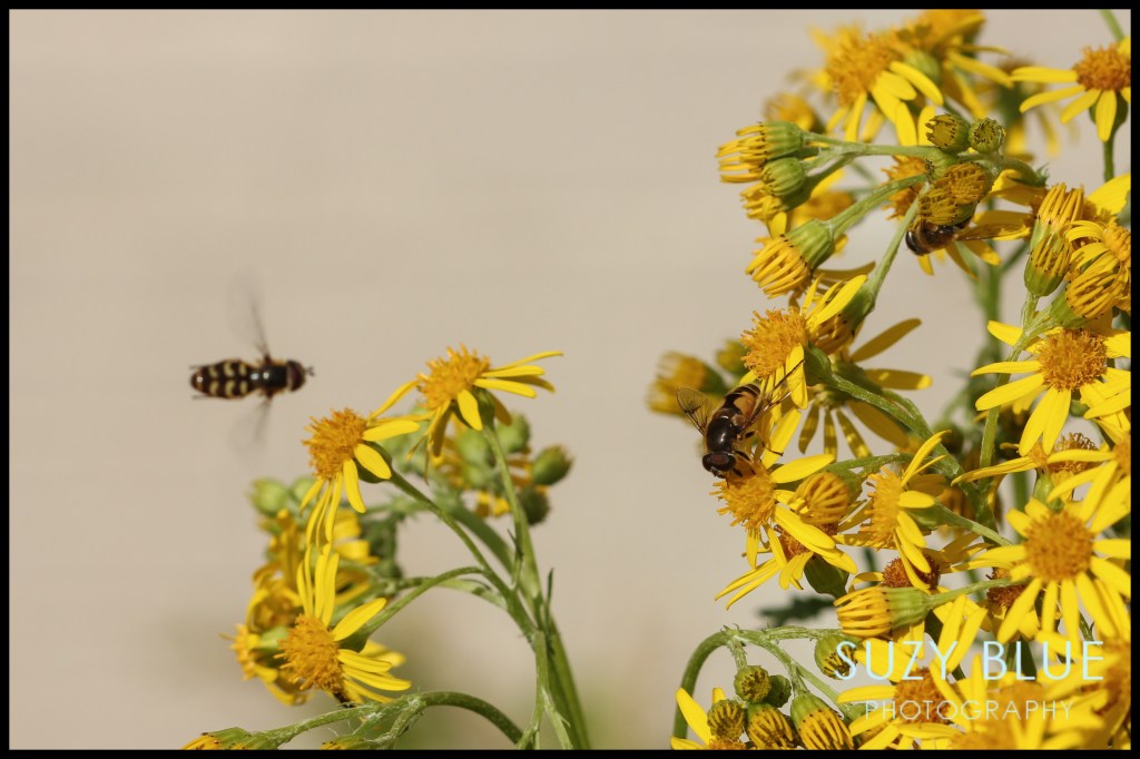 This shot gives more of a chaotic feel as the hoverflies busy themselves on this ragwort as another flies in.