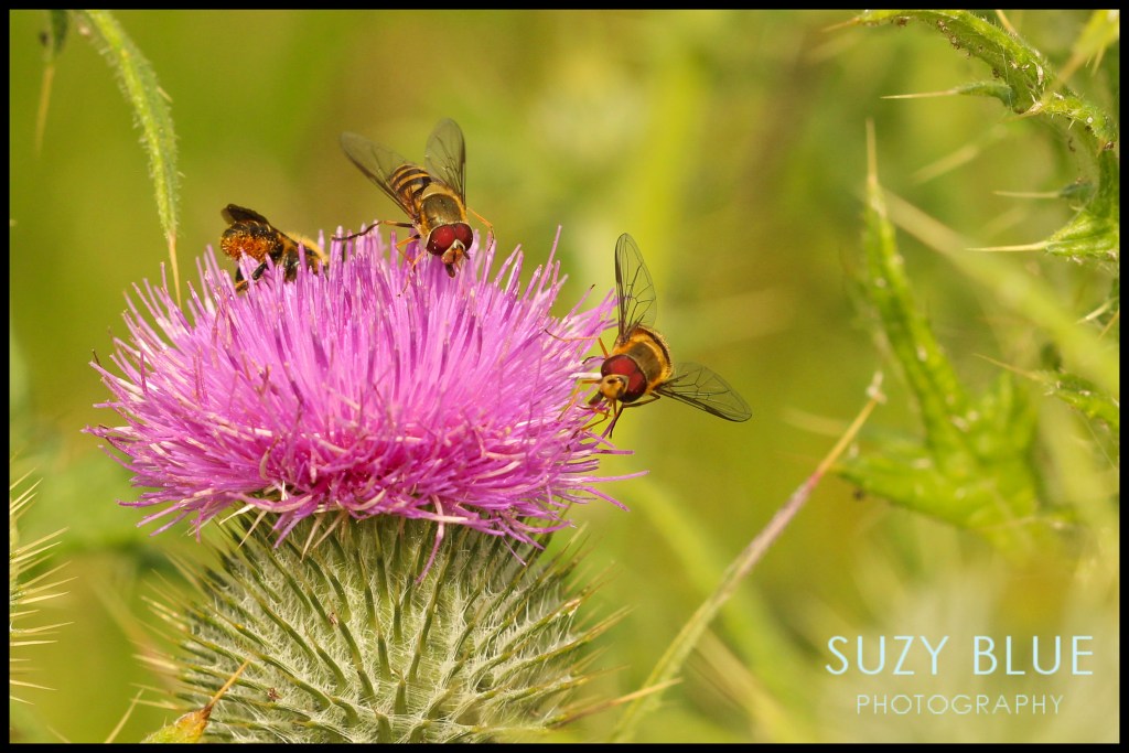 These hoverflies (not bees!) are all busy on this thistle flower, going about their business.