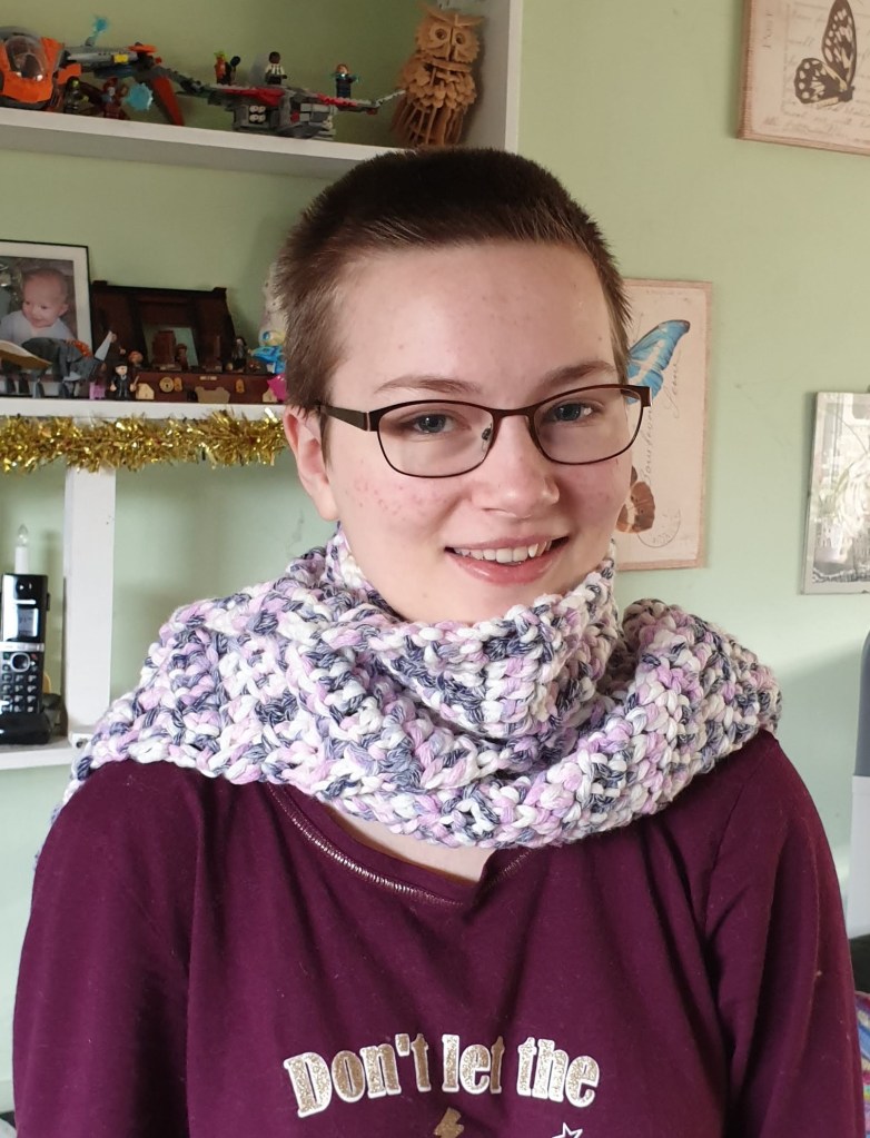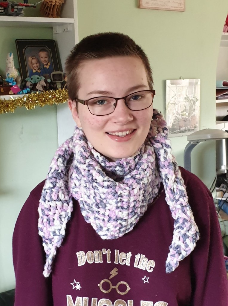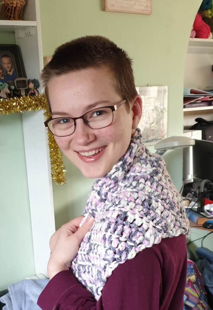 Here’s my daughter beautifully modelling her new scarf/shawl. It was made with some stash yarn and a very large hook! The yarn is Sirdar Denim Ultra – Mega Chunky with Cotton and Wool. Not sure if they make this anymore, it’s from the depths of the stash, and is probably older than my daughter is! I needed to use a 10mm hook which felt so weird compared with the 4mm I’m using for my cardi.
