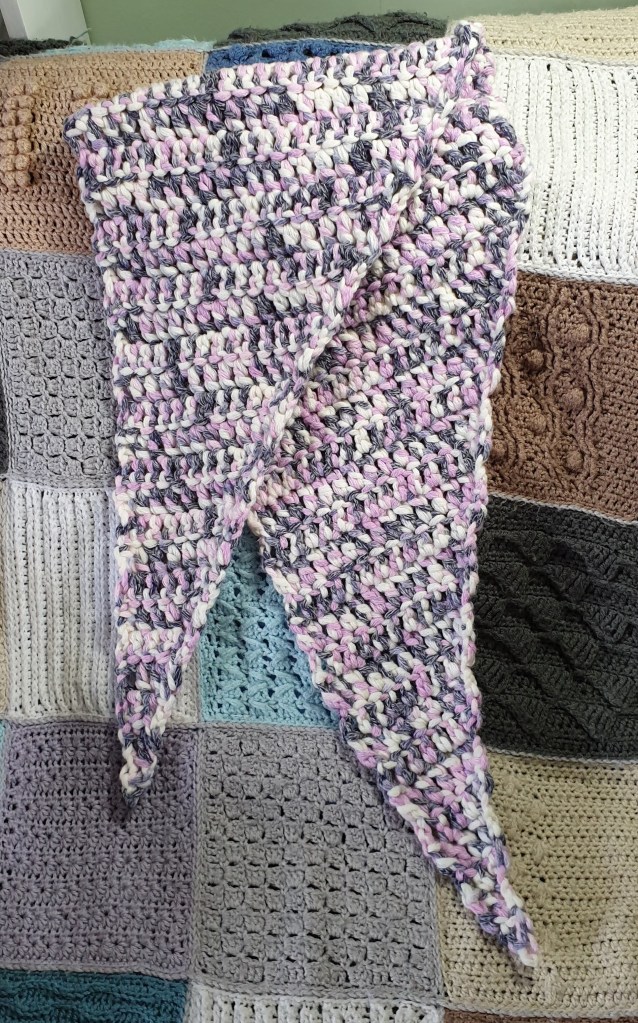 Like last week, no progress with the Kaleidoscope CAL, but I’ve been working on my lilac cardi, and took a short break from that to make my daughter a scarf/shawl.