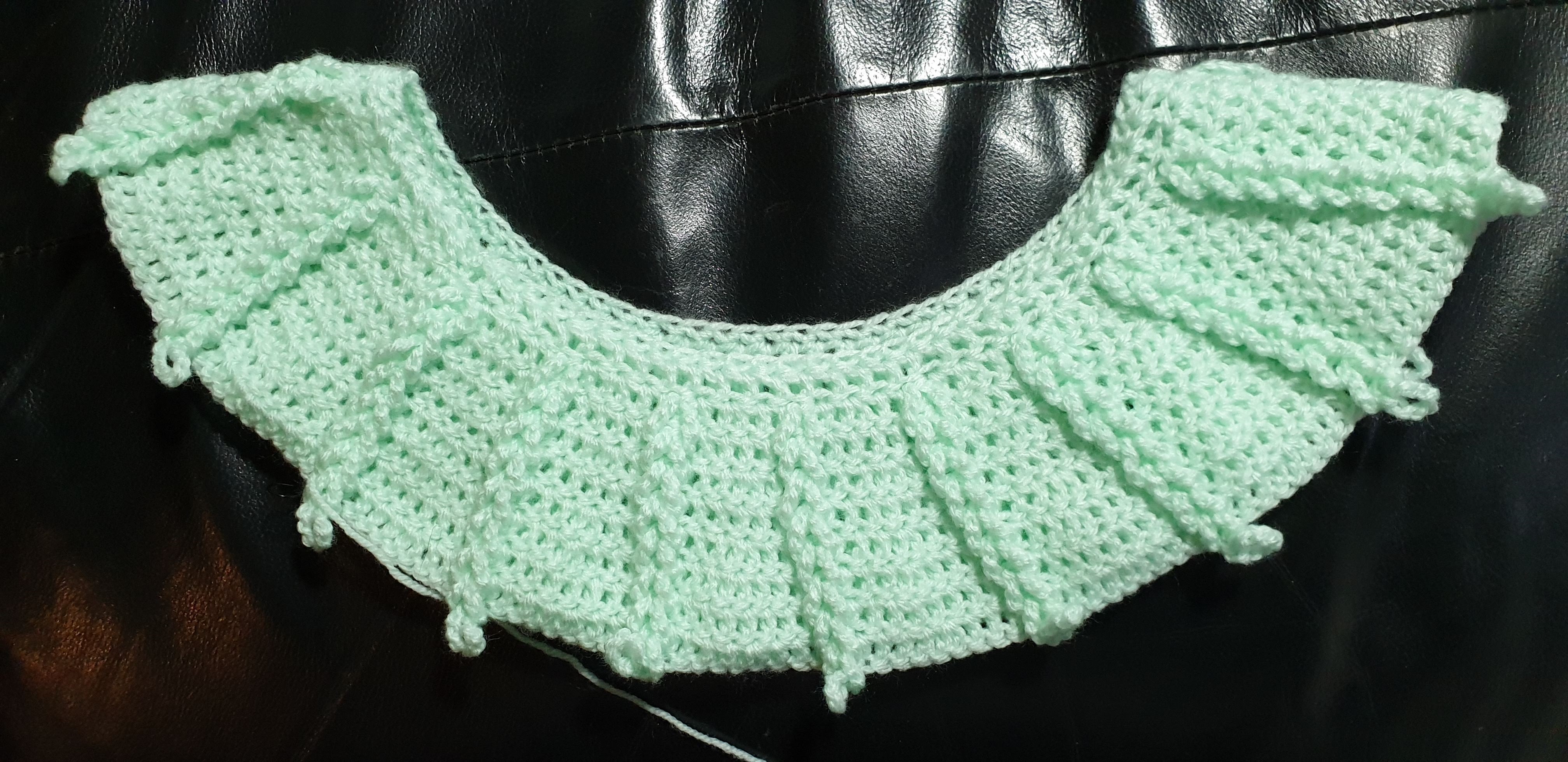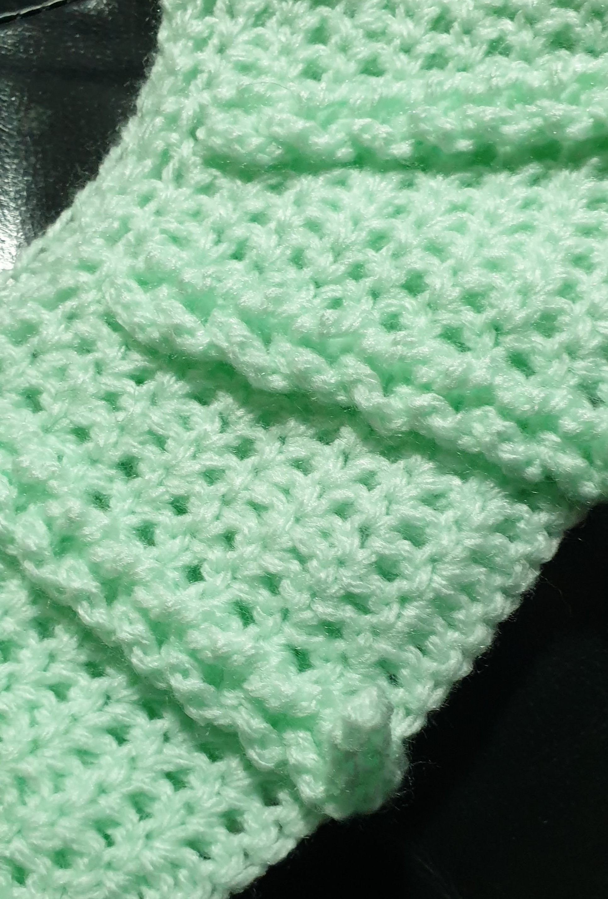 As I now have some waiting in between parts, I fancied making something else in between. I have been frogging the lilac cardi so I could redo it to make it fit better, but frogging is a bit depressing so I decided to start something new. I was looking through the patterns I have and I found one called ‘Leila Sweater’ by Courtney A Clark of ilovetinderbox.com. I looked a the picture and thought, yes this looks good, I’ll make this. And then, when I looked closer at the pattern I realised it uses the same loopy braiding as we’ve done twice in the Pandemonium CAL… so that was it – it was meant to be! I bought a bunch of mint green yarn a while ago, so I’m using that:
